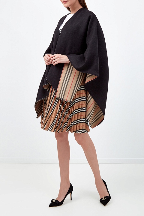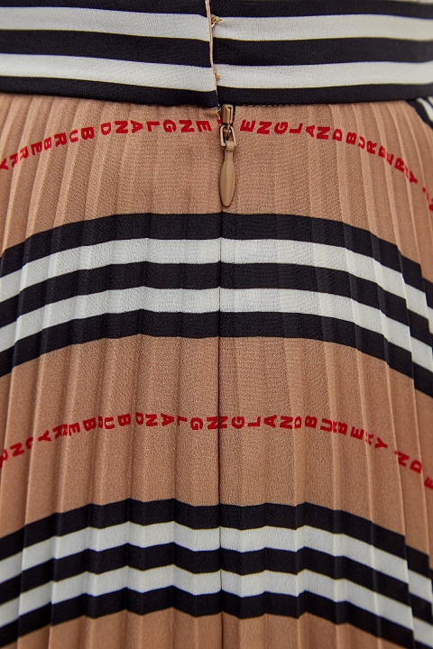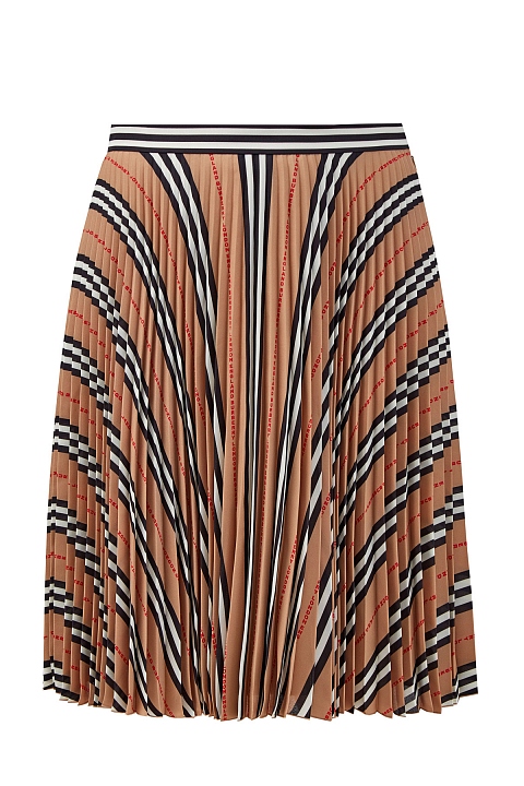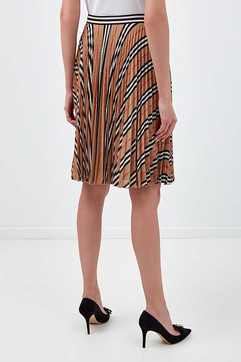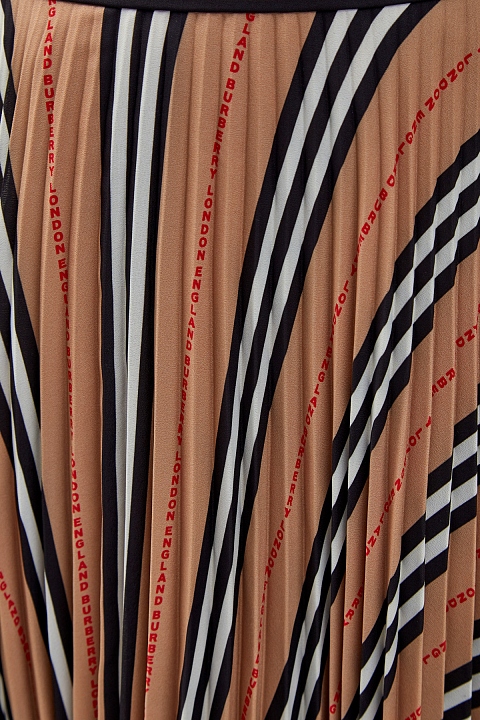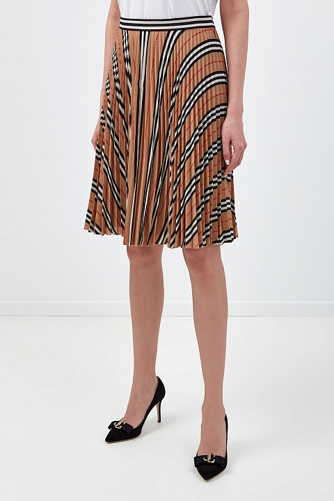 Юбка-плиссе из крепа от Burberry. Геометрию образа выстраивает фирменный принт в полоску, дизайн которого был специально разработан для каждого элемента кроя. Подкладка из натурального шелка обеспечивает максимальный комфорт. Детали: широкий притачной пояс, застежка на потайную молнию. Сделано в Италии.