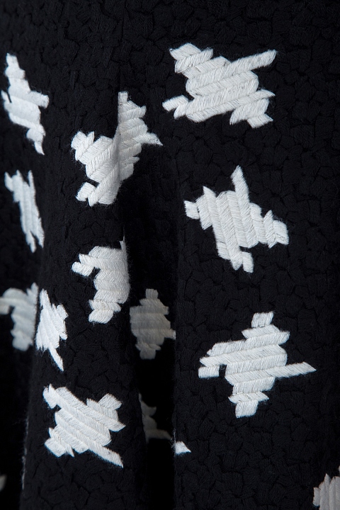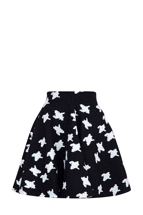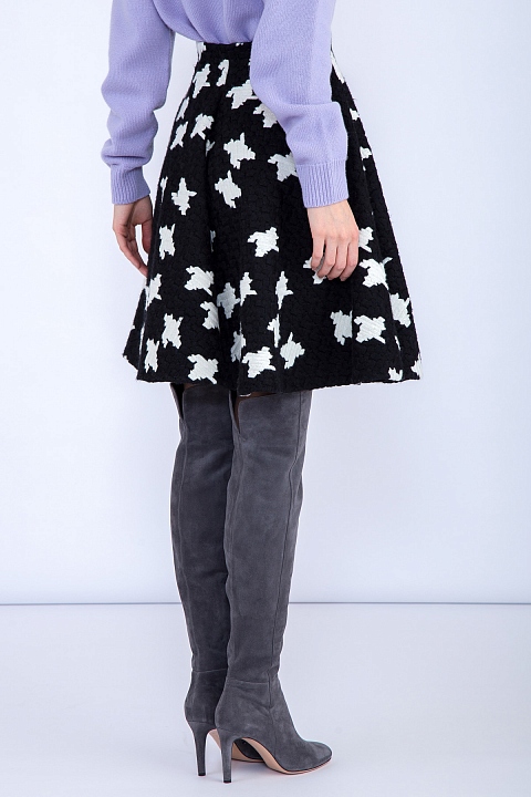 Оригинальная юбка А-силуэта из коллекции Ermanno Scervino. Модель выполнена из фактурной шерсти черного цвета и декорирована абстрактным контрастным узором цвета слоновой кости. Изделие с классической посадкой на талии и объемными складками. Потайная застежка-молния. Сделано в Италии.