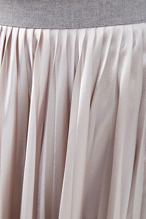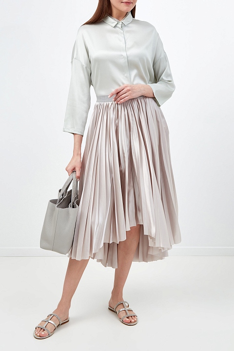 Юбка от Fabiana Filippi выполнена из струящегося атласа в пастельном жемчужно-розовом оттенке. Плиссированная фактура подчеркивает каждое движение. Гладкая ткань в сочетании с трикотажным поясом и асимметричным нижним краем образует универсальное изделие в присущем бренду стиле sprezzatura. Сделано в Италии.