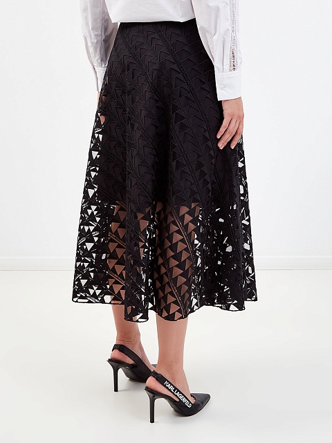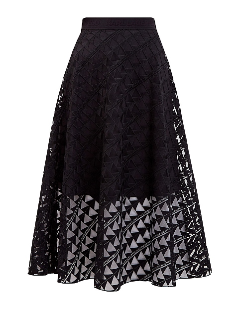 Расклешенная юбка-миди от Karl Lagerfeld представлена в базовом черном цвете. Текстурированная ткань с вышитым all-over принтом в виде геометрического логотипа бренда придает линиям четкость и хорошо сохраняет форму. Детали: подкладка в тон, широкий притачной пояс с жаккардовой монограммой.