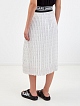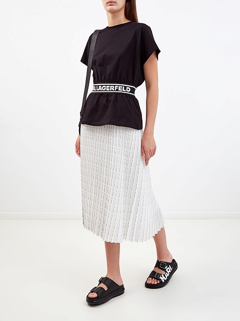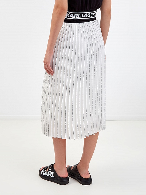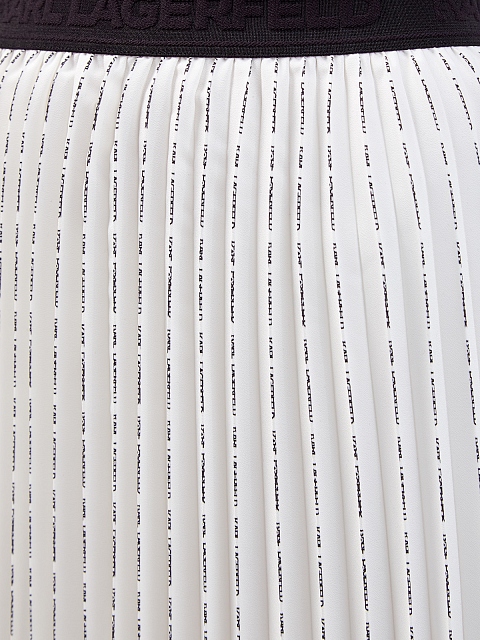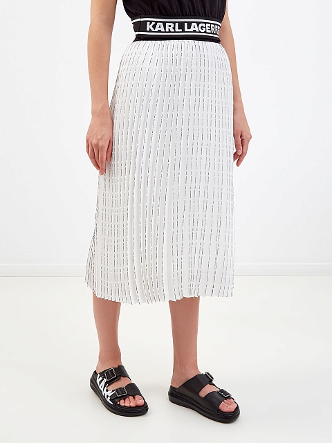 Юбка-плиссе от Karl Lagerfeld выполнена из eco-friendly шифона, который подчеркивает летящие линии кроя. Принт в виде монограммы Модного дома акцентирует внимание на текстуре материала, а притачной широкий пояс с монограммой бренда вносит контрастный акцент. Детали: изделие полностью на подкладке, длина миди.
