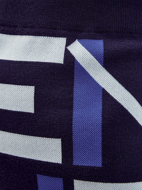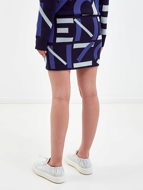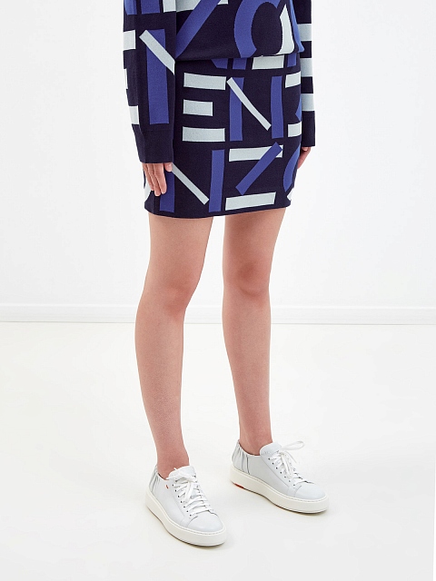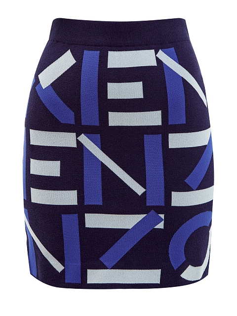 Эффектная юбка-мини от Kenzo создана в синих, черных и белых тонах из плотной пряжи. Износостойкий материал на основе хлопка и эластана не образует складок, эластичный пояс обеспечивает комфортную посадку. Жаккардовый макро-узор с монограммой бренда вносит неформальный штрих в повседневный образ.