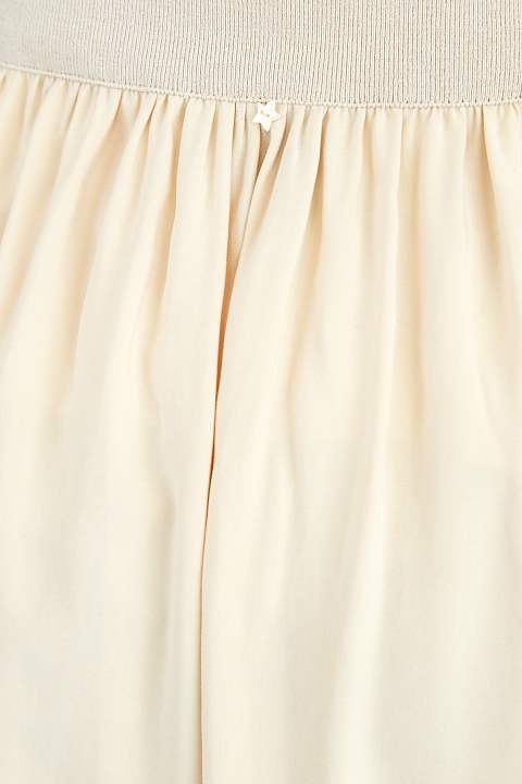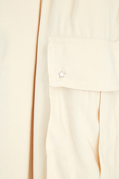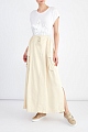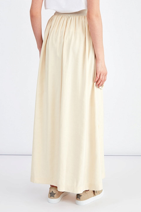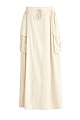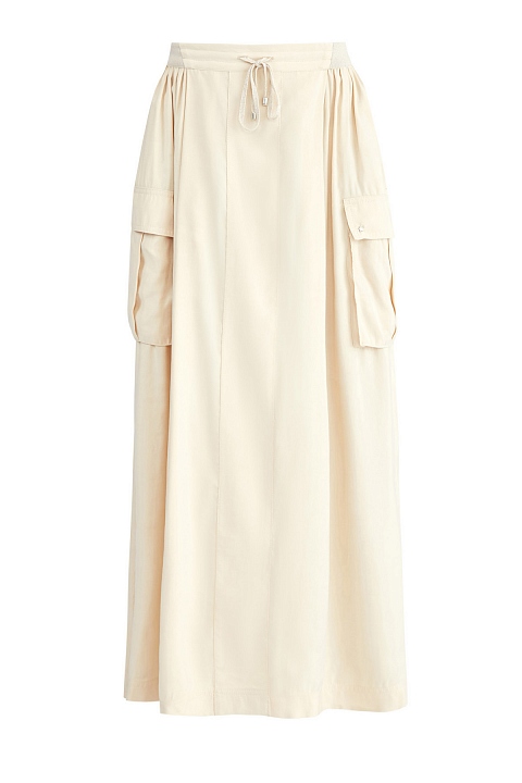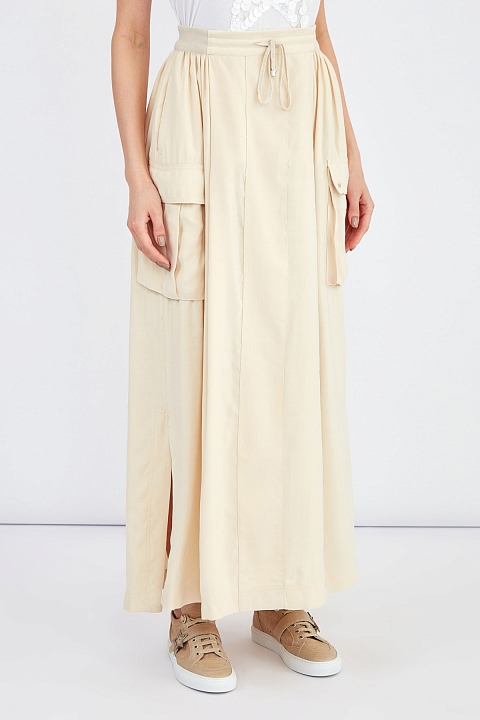 Расклешенная юбка-макси от Lorena Antoniazzi выполнена из мягкого материала с бархатистой поверхностью в пастельном сливочно-бежевом оттенке. Модель дополнена объемными накладными карманами с клапанами в стиле карго по бокам, а также драпировками от линии талии. Детали: трикотажный пояс в рубчик на кулиске, разрезы в боковых швах, заклепки в виде символики бренда. Сделано в Италии.