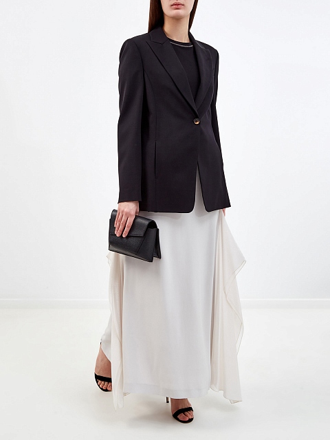 Элегантная юбка от Lorena Antoniazzi создана из держащей форму костюмной вискозы — дышащей ткани на основе древесных волокон. Строгий прямой силуэт дополнен драпировками из мерцающего шифона по бокам. Высокая посадка подчеркивает линию талии за счет широкого пояса. Вытачки обеспечивают посадку по фигуре. Детали:застежка на потайную молнию, два кармана, разрезы в боковых швах. Сделано в Италии.