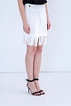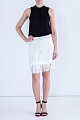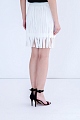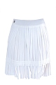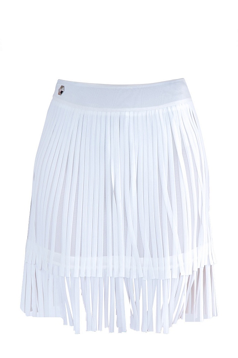 Эффектная юбка прямого силуэта из коллекции Philipp Plein. Модель выполнена из натурального плотного шелка молочного оттенка и декорирована стильной бахромой по всей поверхности. Изделие с тонким конструктивным поясом, украшенным металлическим лейблом бренда. Застежка осуществляется на потайную молнию сбоку. Произведено в Италии.