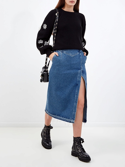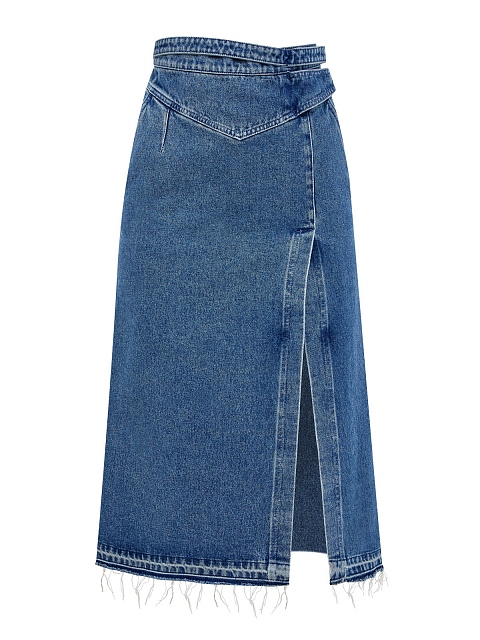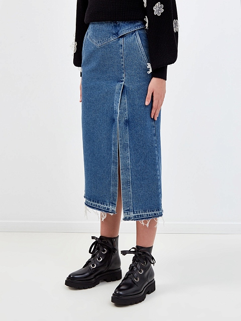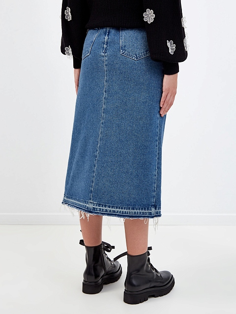 Юбка-карандаш длины миди от REDValentino создана из хлопкового денима в классическом синем цвете. Эффект необработанного края и окрашивание в технике тай-дай придают образу неформальный штрих. Передняя планка изделия продолжена пряжками на боковой панели, высокий разрез от нижнего края обеспечивает комфорт в движении. Детали: отделка кромок бахромой, накладные и прорезные карманы, нашивка из кожи с декором «пуэн-деспри» на спинке.