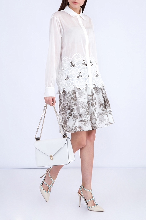 Изящная юбка Rochas расклешенного кроя, выполненная из плотного хлопка белого цвета со сплошным тропическим монохромным мотивом, поддерживающим тематику коллекции. Модель характеризуется множеством складок, расходящихся по подолу от широкого пояса с потайной застежкой-молнией и деталью на запахе, создающей дополнительный объем.