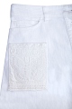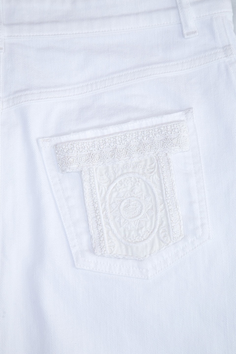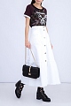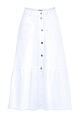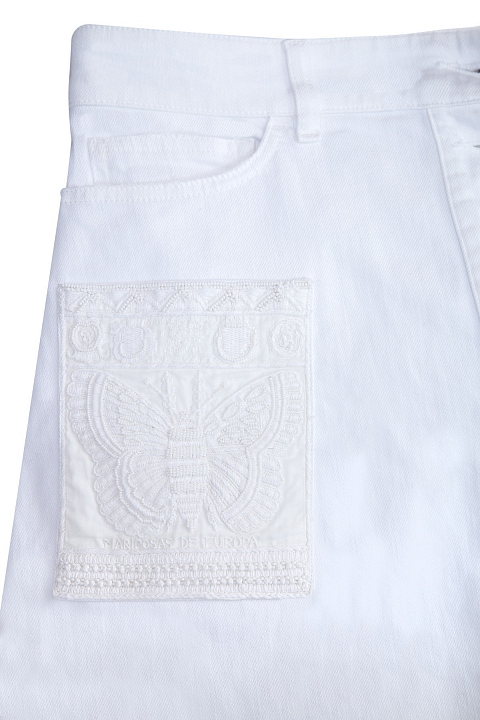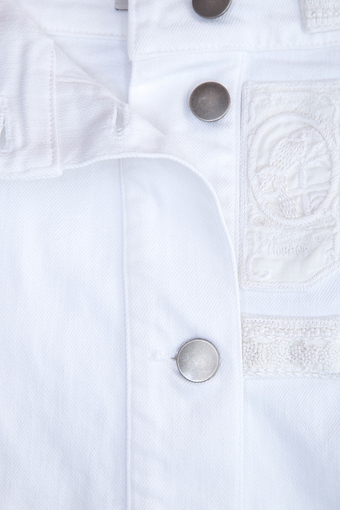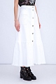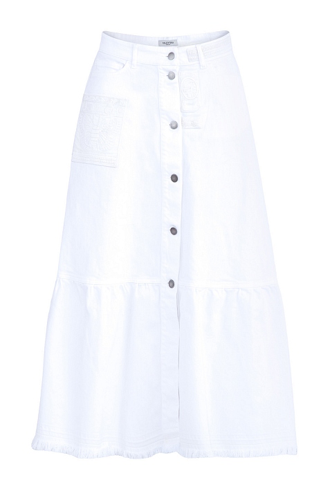 Эффектная юбка трапециевидного кроя из коллекции Valentino, выполненная из плотного хлопкового денима белоснежного цвета. Модель оформлена ручной вышивкой нитью в тон, отсылающей к мотивам, украшающим коробки кубинских сигар. Изделие с притачным поясом, планкой с мягкими складками, пристроченной к нижней кромке. Застежка осуществляется на ряд пуговиц в центральной планке. Сделано в Италии.