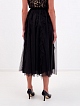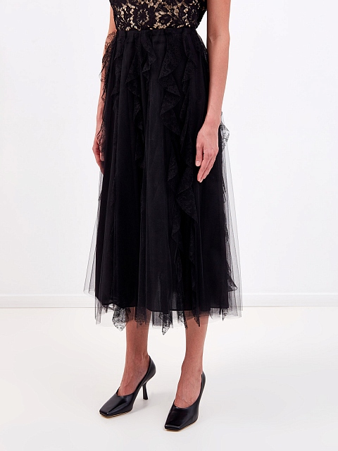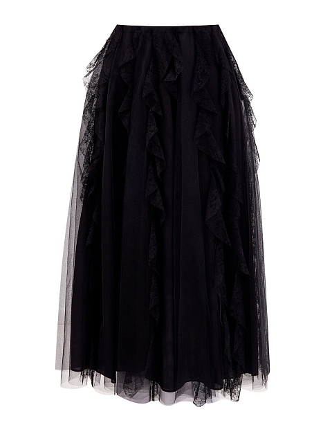 Эффектная юбка-миди от Valentino представлена в глубоком черном цвете. Плиссированная многослойная текстура и легкая вуаль повторяют движения тела и идеально подходят для создания повседневных и вечерних образов. Изысканный штрих — вышивка ручной работы из тонкого кружева Heavy Lace. Сделано в Италии.