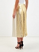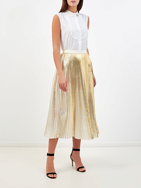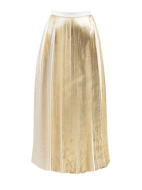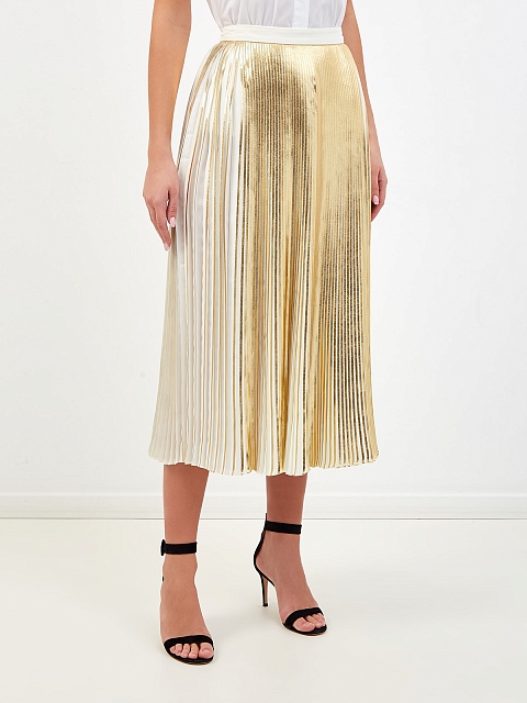 Юбка-миди от Valentino выполнена из технического жоржета молочно-белого оттенка. Струящийся, эластичный материал подчеркивает летящий силуэт, а ламинирование оттенка металлик акцентирует плиссированную фактуру. Широкий пояс обеспечивает комфортную посадку на талии. Потайная застежка-молния завершает изделие. Сделано в Италии.