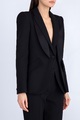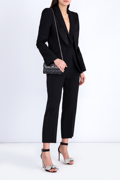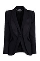Классический женский жакет Alexander McQueen приталенного кроя на одной пуговице из легкой ткани в составе шерсти и шелка черного цвета. Модель характеризуется объемными линиями плеч, образованными подплечниками, двойными лацканами с атласной отделкой и наклонными карманами по бокам. Сделано в Италии.