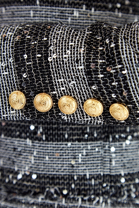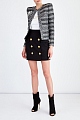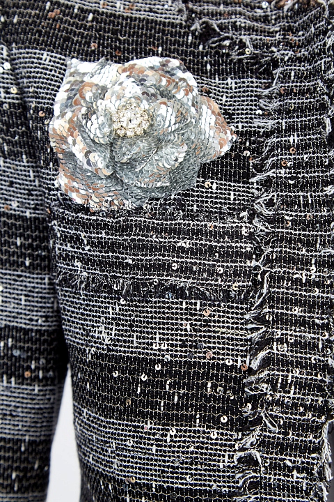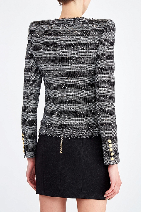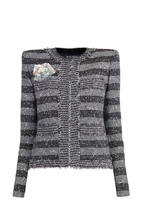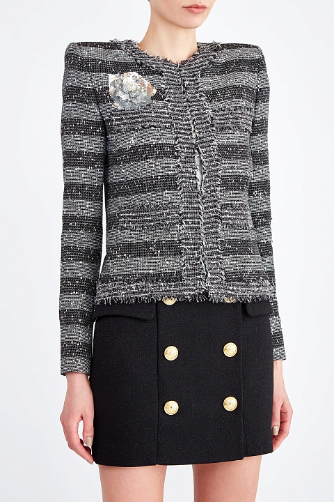 Приталенный жакет от Balmain выполнен из ткани с переплетенными нитями белых и черных тонов. Необычная текстура материала, которая напоминает холщовую ткань, дополнена вплетенными мерцающими пайетками. Отделка в виде бахромы, накладные карманы и принт в полоску придают модели нотку неформального шика и контрастируют с расшитой вручную аппликацией в виде цветка. Детали: потайная застежка, внутренняя подкладка, моделирующие вставки на плечах.
