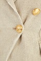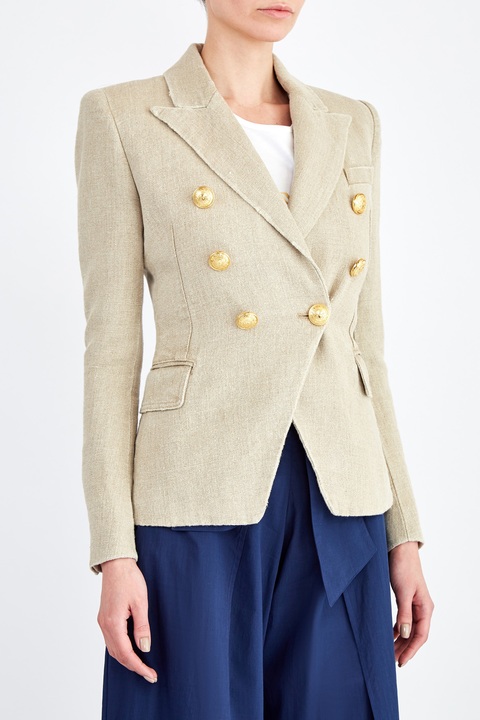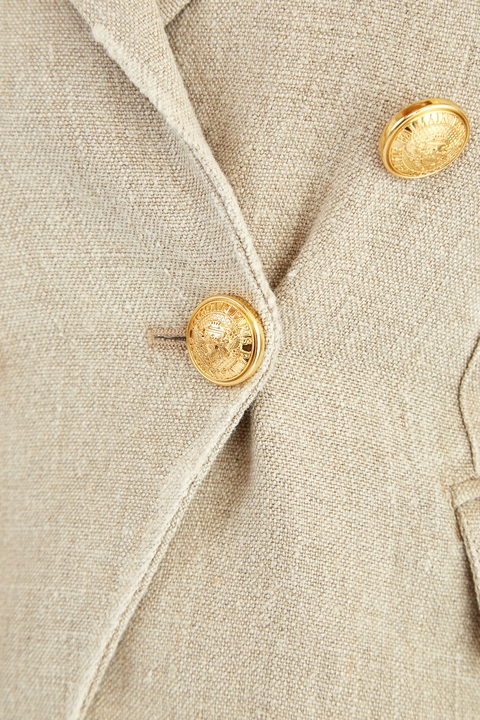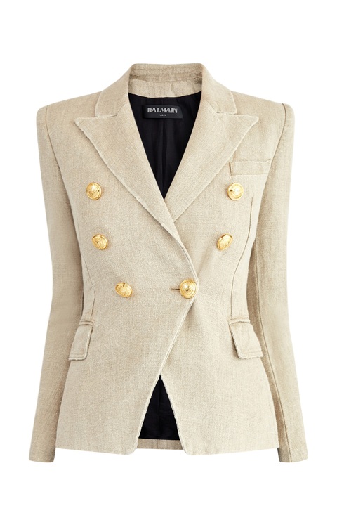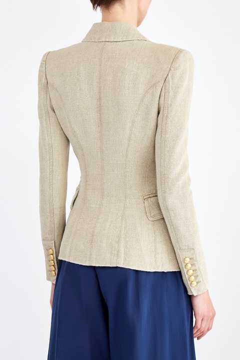 Стильный жакет от Balmain создан из фактурной льняной ткани. Натуральная холщовая текстура материала, , а также природный бежевый оттенок контрастирует с винтажными пуговицами с тисненым изображением герба Модного дома. Детали: фирменная фурнитура с золотистым напылением, внутренняя подкладка, швы с эффектом потертости, заостренные лацканы.