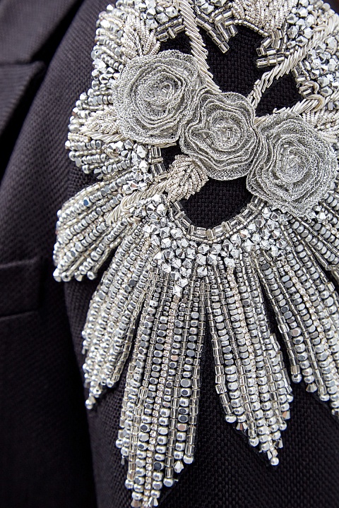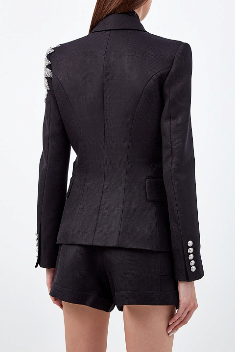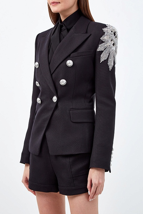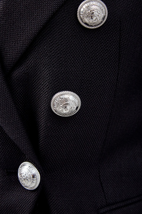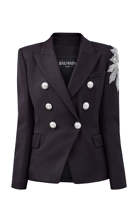 Двубортный жакет от Balmain с бархатистой пудровой фактурой. Фирменный силуэт сформирован за счет выраженной линии плеч и четко очерченной талии, плотная ткань подчеркивает структурированный крой. Модель полностью на подкладке из вискозы и хлопка. Вышивка бисером выполнена вручную и вносит в образ нотку стиля милитари. Детали: лацканы заостренной формы, карманы с клапанами, застежка на фирменные пуговицы с тисненым гербом Модного дома. Длина по спинке 58 см.