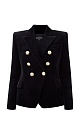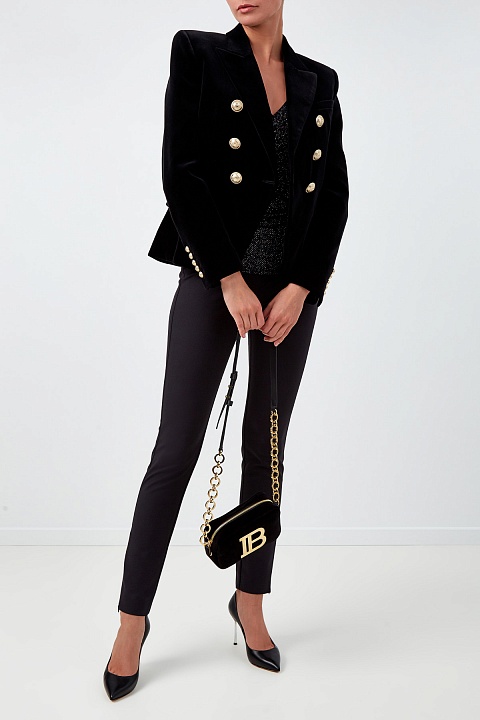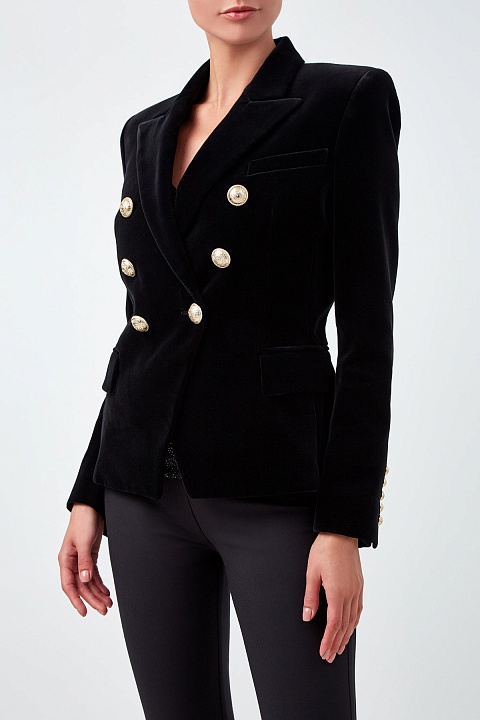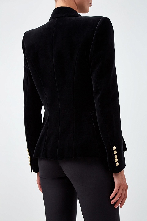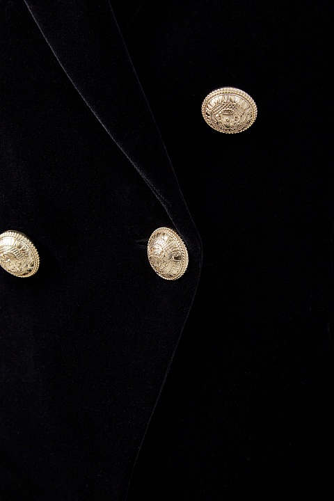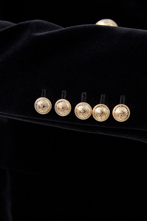 Двубортный жакет от Balmain полностью выполнен из велюра. За счет своей фактуры ткань поглощает свет и смотрится особенно эффектно с глянцево-золотистыми пуговицами. Фирменный силуэт в стиле глэм-рок сформирован за счет выраженной линии плеч, заостренных лацканов и четко очерченной талии. Модель полностью на подкладке из хлопка и вискозы, которая обеспечивает посадку по фигуре.