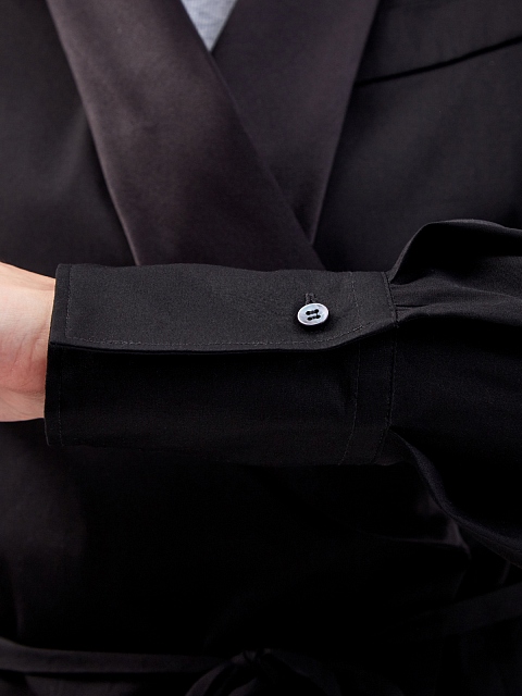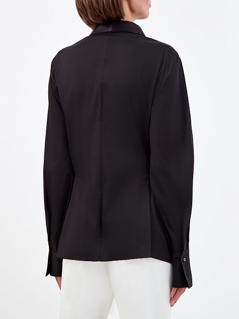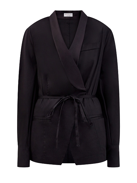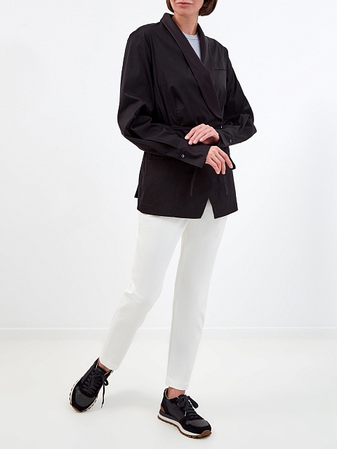 Элегантный жакет от Brunello Cucinelli создан из струящегося твила Fluid — эластичный материал на основе волокон хлопка обеспечивает максимальный комфорт в движении. Модель в матовом черном цвете соединяет в себе классические линии кроя и женственность силуэта. Тонкий пояс в тон обеспечивает посадку точно по фигуре. Детали: широкие рукава с манжетами, карманы с бортами, приталенный крой. Сделано в Италии.