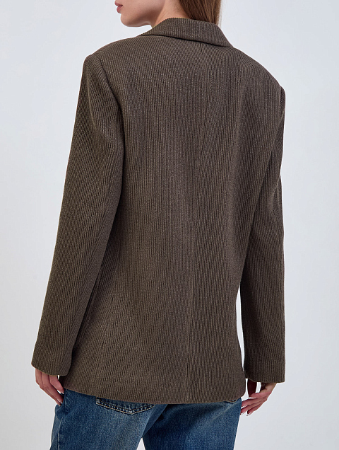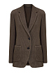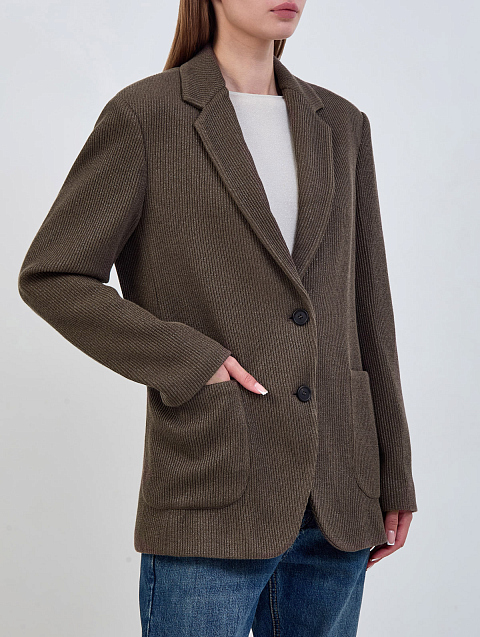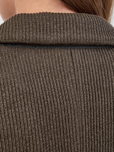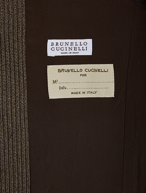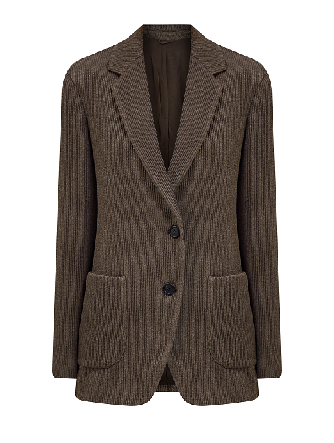 Однобортный жакет в расслабленном стиле от Brunello Cucinelli создан из трикотажа Sparkling, связанного английский резинкой из хлопка, вискозы и нити ламе. Модель с накладными карманами и роговыми пуговицами дополнена изысканной цепочкой Мониль, культовым украшением коллекций Модного Дома, на спинке ворота. Сделано в Италии.
