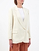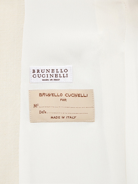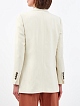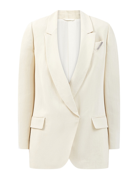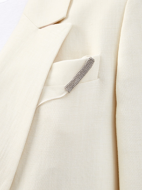 Элегантный жакет от Brunello Cucinelli создан из струящегося твила — фирменный материал на основе волокон вискозы и льна хорошо держит форму и не образует складок. Модель в кремовом оттенке дополнена тонким платком-паше из шелка Crispy, а также вышивкой рядами мерцающих цепочек Мониль. Детали: подкладка из крепа, заостренные лацканы, застежка на кнопки. Сделано в Италии.