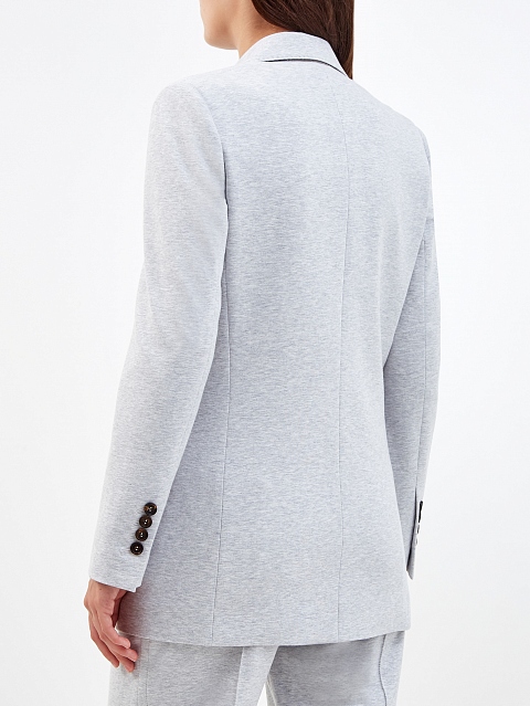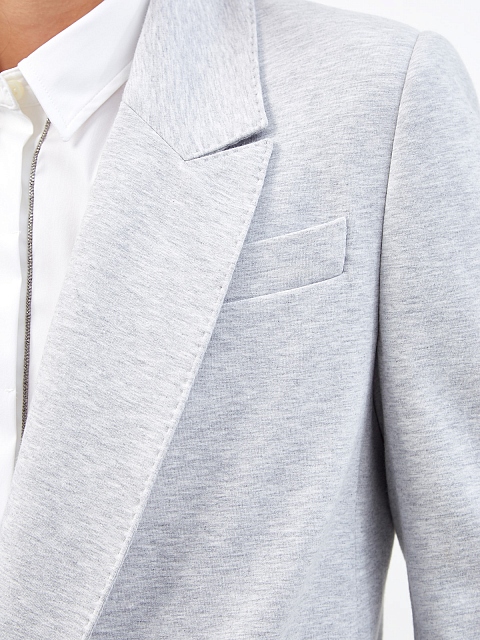 Однобортный жакет ручной работы от Brunello Cucinelli создан из гладкого хлопкового футера. Жемчужно-серый оттенок делает модель незаменимым элементом базового гардероба. Ворот на спинке украшен сияющей цепочкой Мониль, культовый штрих подчеркивает присущий бренду изысканный стиль. Детали: подкладка из атласа, застежка на роговые пуговицы. Сделано в Италии.