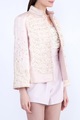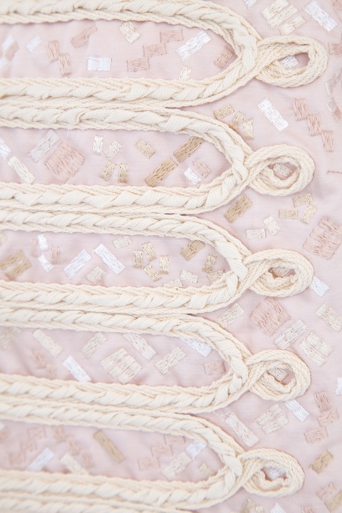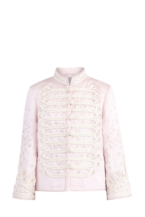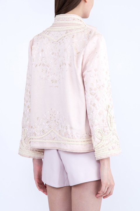 Эффектный жакет Ermanno Scervino прямого кроя, созданный из хлопка и льна нежно-розового тона с жаккардовым узором по всей поверхности. Отличительной особенностью модели являются застежки в стиле милитари на центральной планке, крупные пуговицы и объемные вышивки на поверхности. Изделие с воротом-стойкой и длинными рукавами. Сделано в Италии.