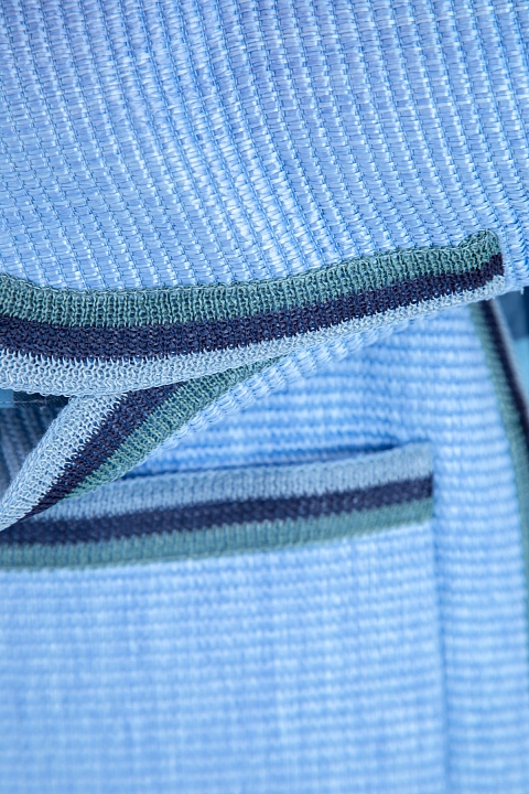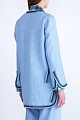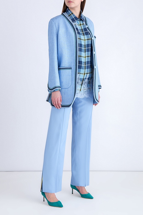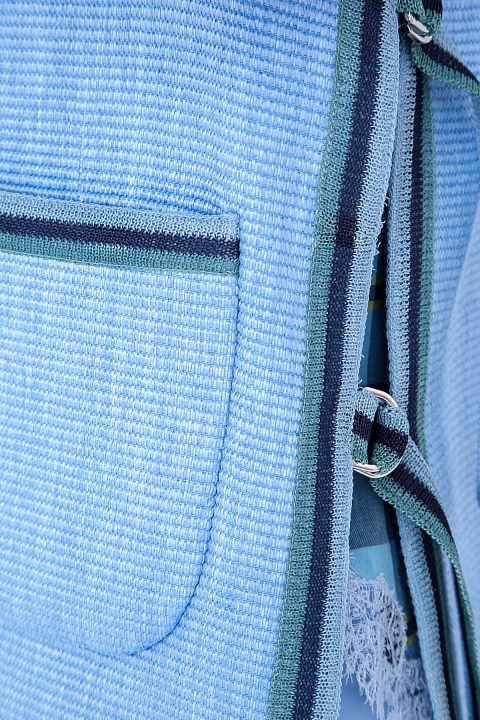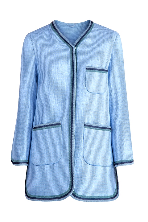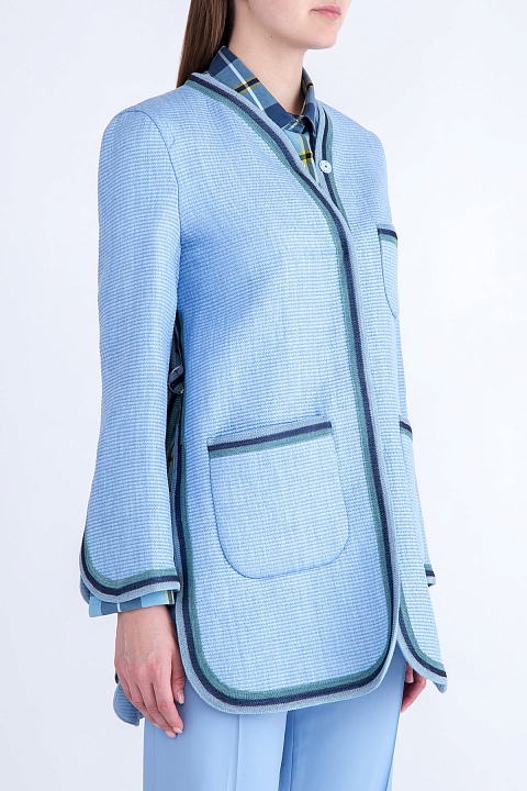 Элегантный женский жакет из весенне-летней коллекции Ermanno Scervino соткан из плотных нитей небесно-голубого оттенка с нежным сатиновым мерцанием. Внутренняя отделка выполнена из мягкого хлопка в тон изделию. Модель прямого силуэта со слегка расклешенными рукавами и плавными линиями кроя дополнена вязаной тесьмой в бирюзово-синей гамме по кромкам накладных карманов, манжетам рукавов, а также по вырезу горловины и подолу. Боковые швы с декоративными разрезами оснащены регулирующими ширину в области талии ремешками. Сделано в Италии.