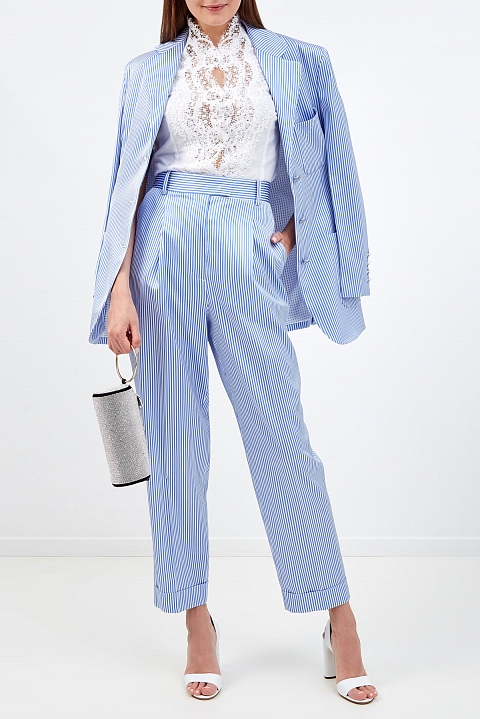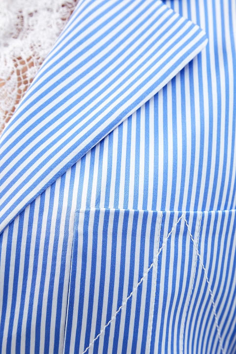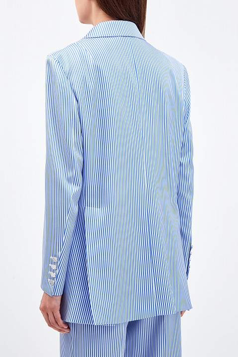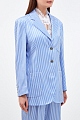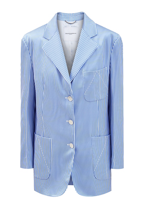 Женский блейзер в стиле oversize от Ermanno Scervino создан из гладкого атласа stretch с легким сияющим финишем. Выверенный состав ткани делает модель идеальной основой для летних аутфитов. Расслабленный акцент образу придает лаконичный принт в полоску в белых и голубых тонах. Классические лацканы и однобортная застежка на пуговицы подчеркивают строгие линии кроя. Детали: три накладных кармана, вытачки для посадки по фигуре, брендированная фурнитура с серебристым напылением. Сделано в Италии.