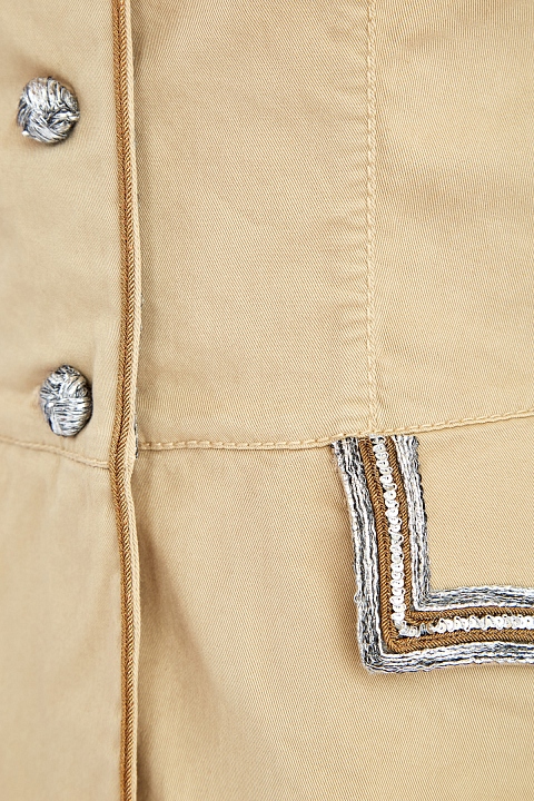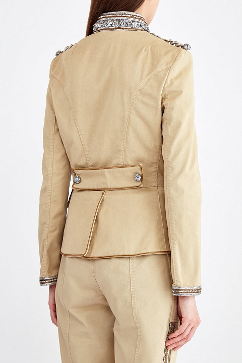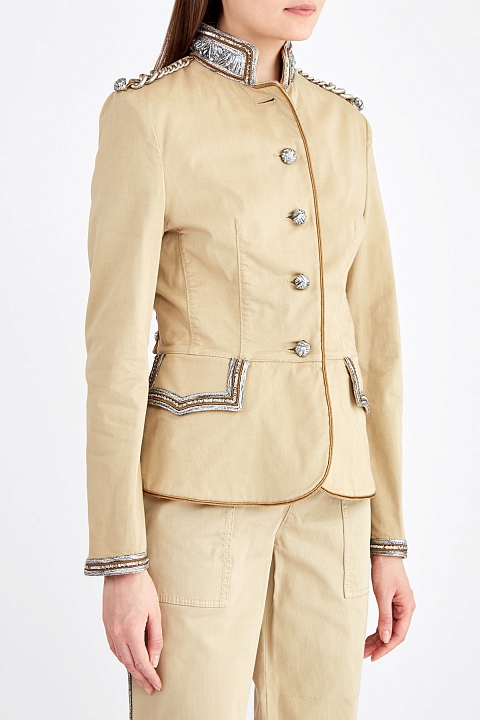 Эффектный женский жакет от Ermanno Scervino выполнен из хлопкового габардина песочного оттенка. Образ в стиле милитари создает аутентичный крой с воротом-стойкой, хлястиком на спинке и клапанами на карманах, а также отделка в виде массивных цепей на плечевых швах. Кромки изделия вручную расшиты нитью люрекса и пайетками. Застежка на массивные пуговицы с эффектом плетения завершают дазайн. Сделано в Италии.