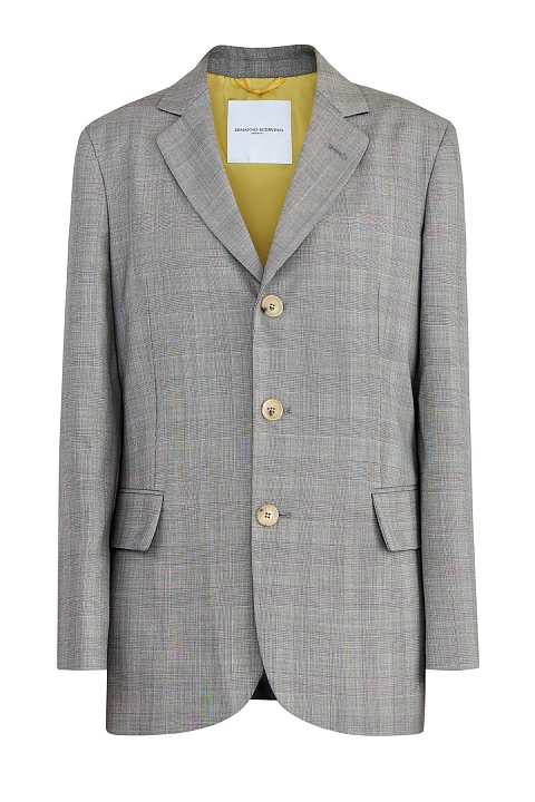 Строгий жакет от Ermanno Scervino выполнен из легкой шерстяной ткани с принтом в клетку «Принц Уэльский». Модель в базовом сером цвете дополнена застежкой на пуговицы из рога, а также воротником с лацканами и прорезными карманами с клапанами. Выверенный крой с вытачками и подкладка из купро обеспечивают посадку по фигуре. Сделано в Италии.