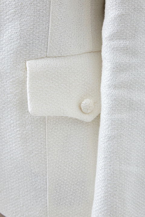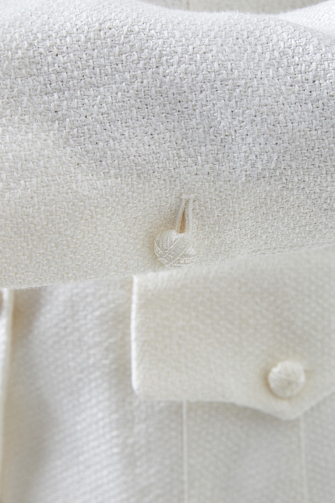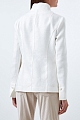Эффектный жакет приталенного кроя от Ermanno Scervino выполнен из фактурной льняной ткани молочно-белого оттенка. Образ в стиле милитари создает заимствованный у военной униформы крой с двойным воротом-стойкой и фигурными клапанами на карманах. Массивные пуговицы дополнены отделкой ручной работы с эффектом плетения. Сделано в Италии.