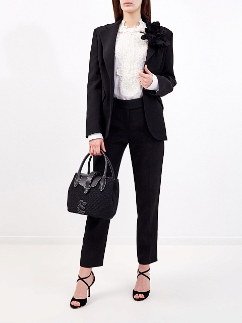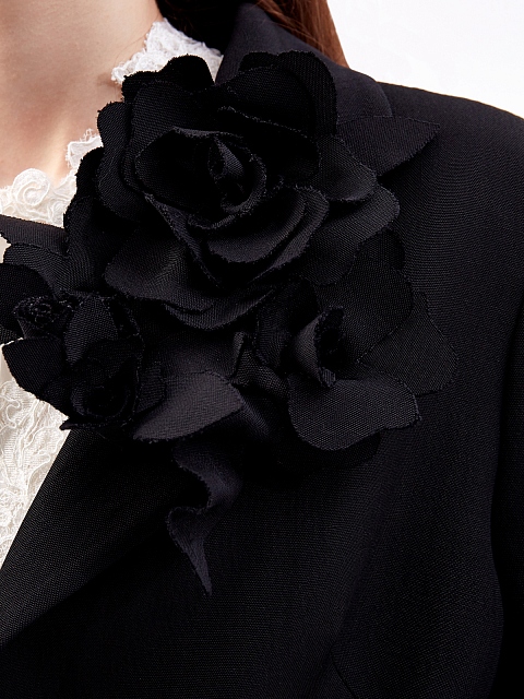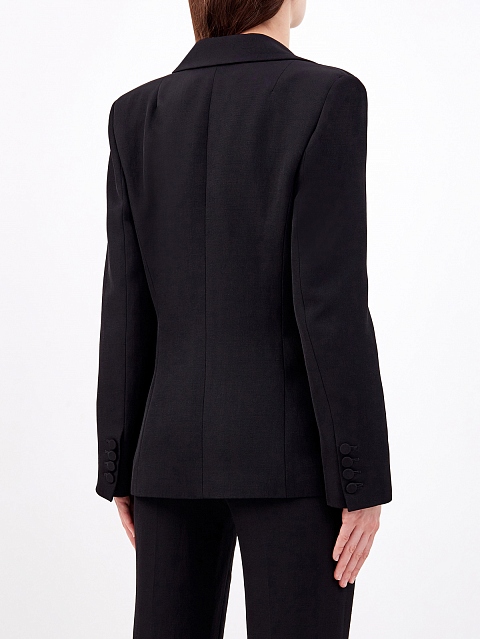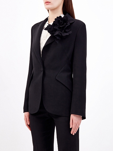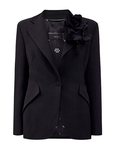 Жакет в элегантном черном цвете от Ermanno Scervino создан из струящегося материала на основе волокон вискозы и льна. Гладкая ткань с деликатным матовым блеском хорошо держит форму и не образует складок. Приталенная модель дополнена объемной брошью с крупными цветами, а также карманами с архитектурными клапанами. Детали: вытачки для посадки по фигуре, атласная подкладка, заостренные лацканы, застежка на пуговицу. Сделано в Италии.