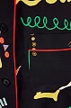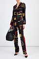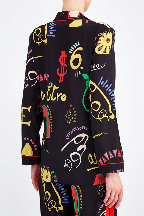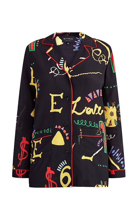 Эффектный жакет прямого кроя от Etro создан из струящегося шелкового крепа с матовой поверхностью черного цвета. Лаконичный фон подчеркивает яркий набивной принт с этническим мотивом. Нотку расслабленного пижамного стиля придает отделка тонкой тесьмой алого цвета. Детали: отложной ворот с лацканами, застежка на пуговицы, два накладных кармана. Сделано в Италии.