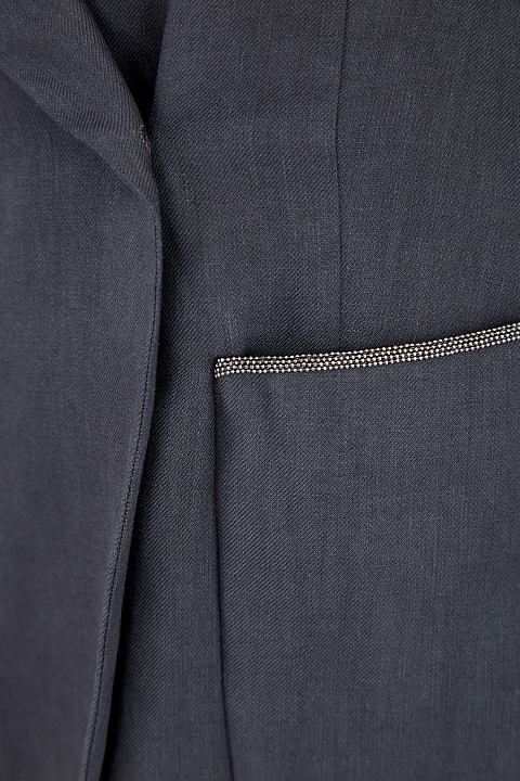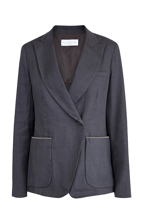 Лаконичный жакет приталенного кроя от Fabiana Filippi выполнен из держащей форму ткани батавия на основе льна и хлопка в графитово-сером оттенке. Модель в неаполитанском стиле дополнена накладными карманами с расшитым вручную мерцающим кантом, а также потайной двубортной застежкой и фигурными лацканами. Вытачки и внутренняя полуподкладка обеспечивают посадку по фигуре. Сделано в Италии.
