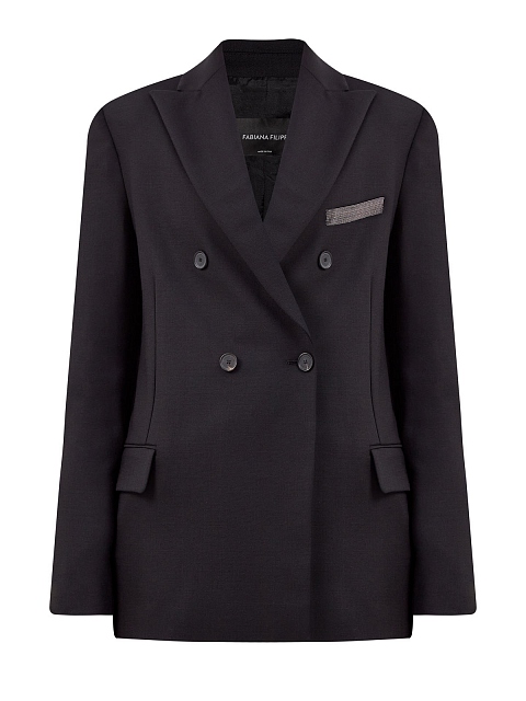 Элегантный женский жакет от Fabiana Filippi создан из тонкой шерстяной ткани в черном цвете, эластичные волокна в составе препятствуют износу и образованию складок. Двубортная застежка на пуговицы и вытачки для посадки по фигуре подчеркивают строгие линии кроя. Изысканный штрих — отделка из мерцающих цепочек на переднем накладном кармане. Детали: классические лацканы, карманы с бортами, приталенный крой. Сделано в Италии.