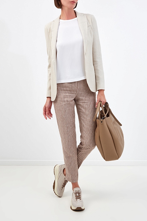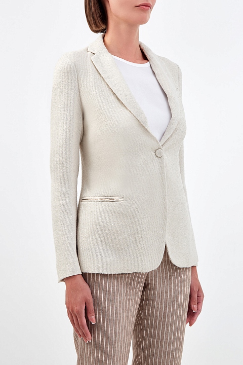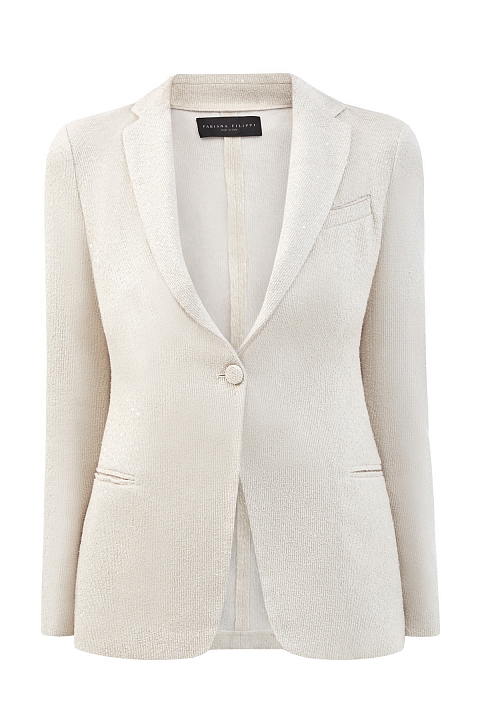 Элегантный приталенный жакет от Fabiana Filippi создан из плотной ткани с текстурой твида. Вплетенные пайетки придают поверхности деликатное мерцание. Лаконичный крой дополнен одной пуговицей и шлицами на спинке для свободы движений. Детали: облегченная конструкция без подкладки, прорезные карманы, воротник с лацканами. Сделано в Италии.