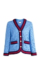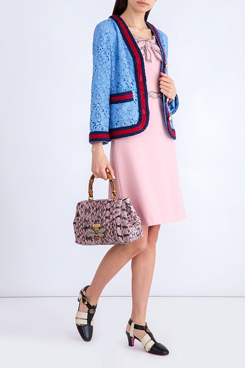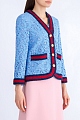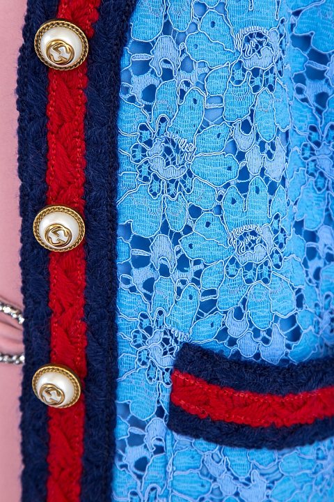 Элегантный жакет расклешенного силуэта из весенне-летней коллекции Gucci выполнен из хлопка и вискозы в нежном васильковом оттенке. Романтический стиль задает ажурный узор с цветочным мотивом и плавные линии кроя, а пуговицы жемчужного цвета с отделкой под античное золото вносят в образ нотки ретро-эпохи. Кромки изделия декорированы фактурной вязаной тесьмой в фирменных темно-синих и алых оттенках. Модель также оснащена двумя накладными карманами на передних планках и струящейся подкладкой в тон для идеальной посадки по фигуре. Сделано в Италии.