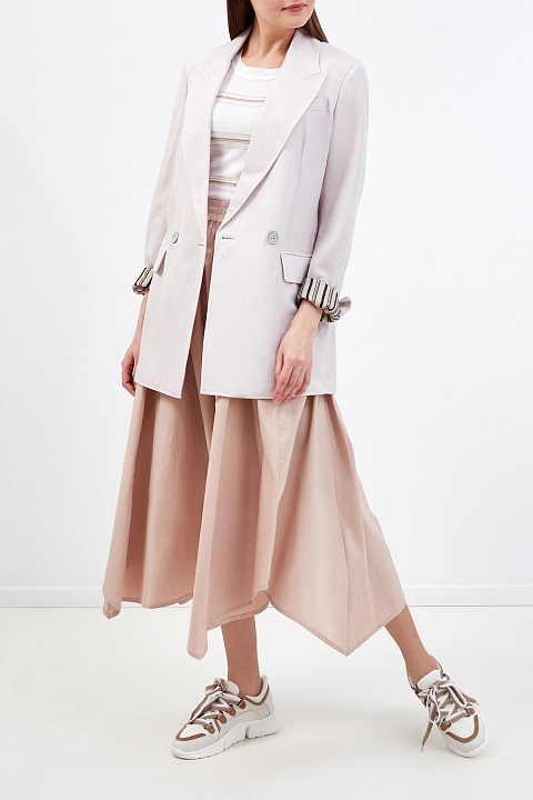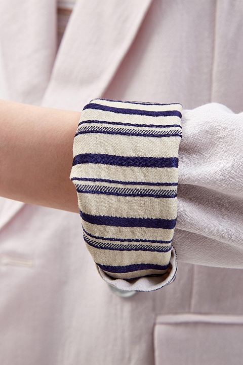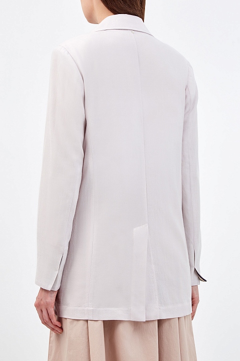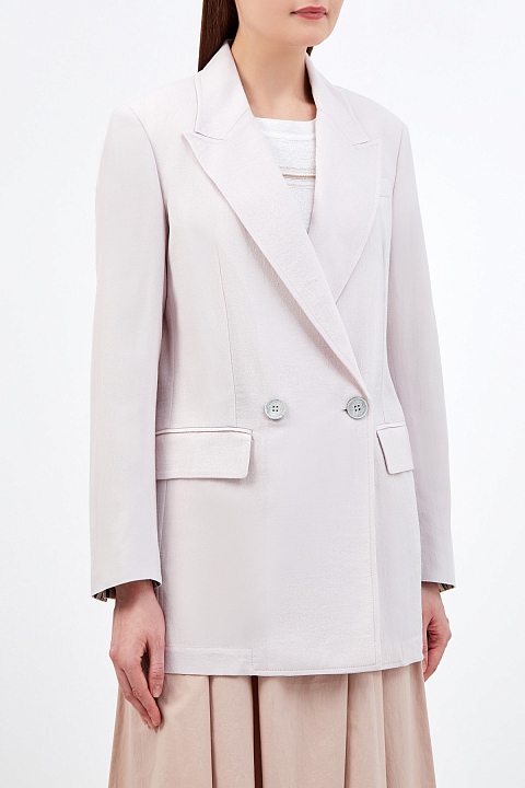 Двубортный блейзер от Lorena Antoniazzi создан из шерстяной ткани в актуальном лавандовом оттенке. Слегка жатая текстура материала смягчает строгие линии кроя. Рукава дополнены подкладкой в полоску, что позволяет мгновенно трансформировать аутфит, сделав его менее формальным, а также создает дополнительные вариации цветовых сочетаний в образе. Детали: шлица для свободы движений, символика бренда на спинке. Сделано в Италии.