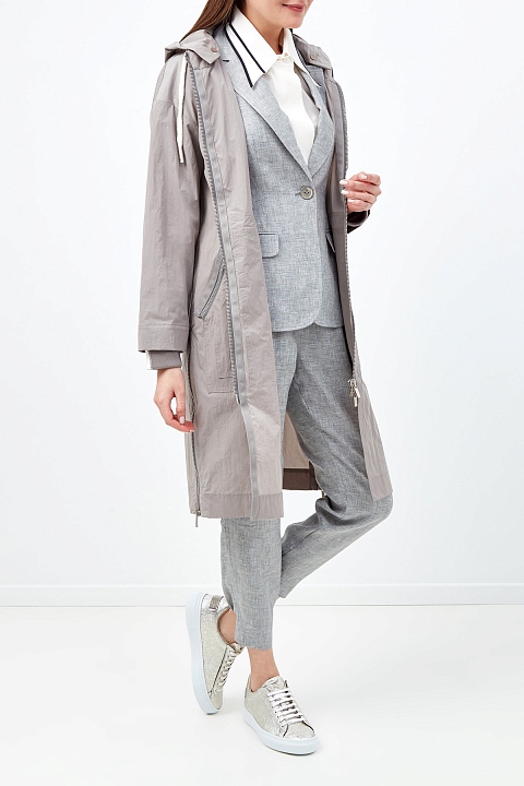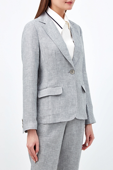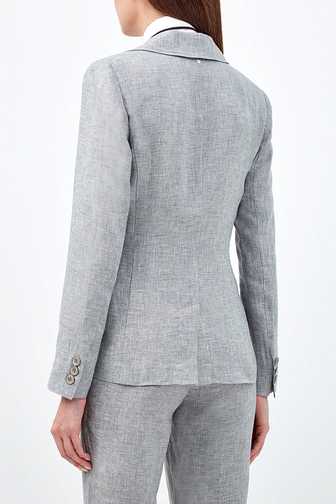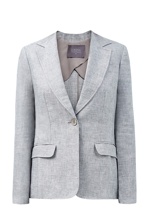 Элегантный жакет от Lorena Antoniazzi создан из фактурного льна в жемчужно-сером оттенке. Натуральная и дышащая ткань обеспечивает максимальный комфорт в летний сезон. Нехарактерная для классических образов ткань в сочетании со строгими линиями кроя придает модели настроение в стиле sprezzatura. Детали: внутренняя полуподкладка и гладкая отделка швов для посадки по фигуре, подплечники, шлица на спинке. Сделано в Италии.