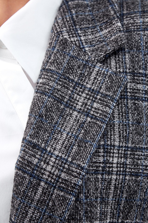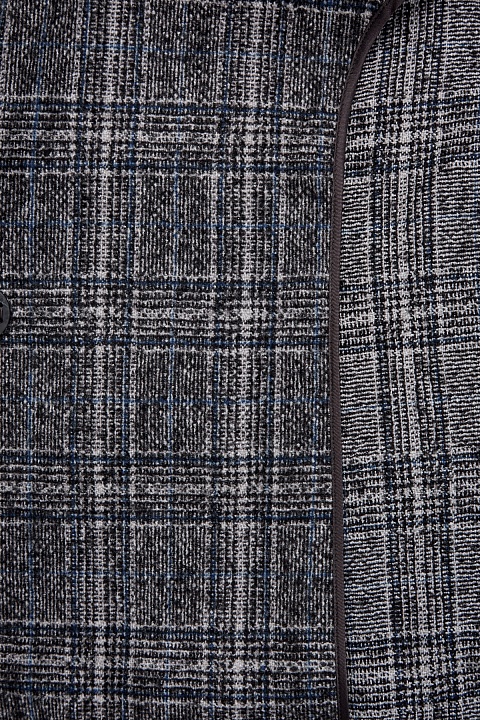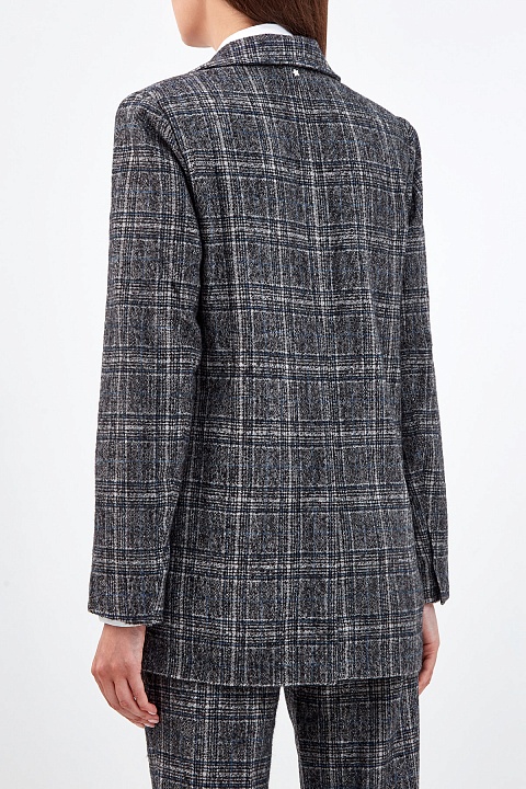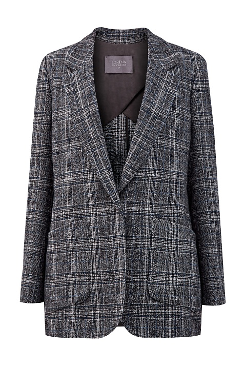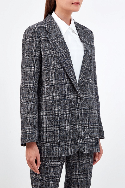 Блейзер из шерстяного твида от Lorena Antoniazzi. Узор в клетку сочетает графитово-серый и синий оттенки, а нить шерсти альпака создает фактурную поверхность. Прямой силуэт дополнен четкой линией плеч в мужском стиле, накладные карманы смягчают строгие линии кроя. Шлица на спинке обеспечивает свободу движений. Детали: застежка на кнопку, символика бренда из перламутра. Сделано в Италии.