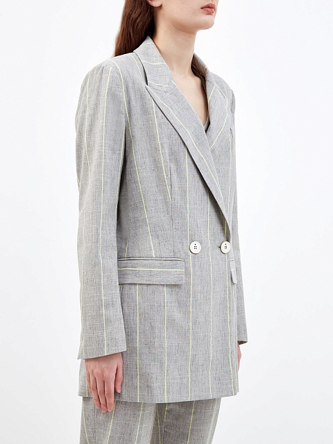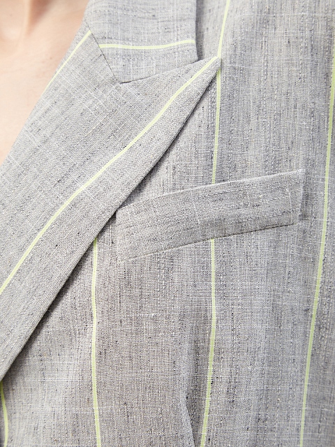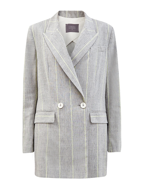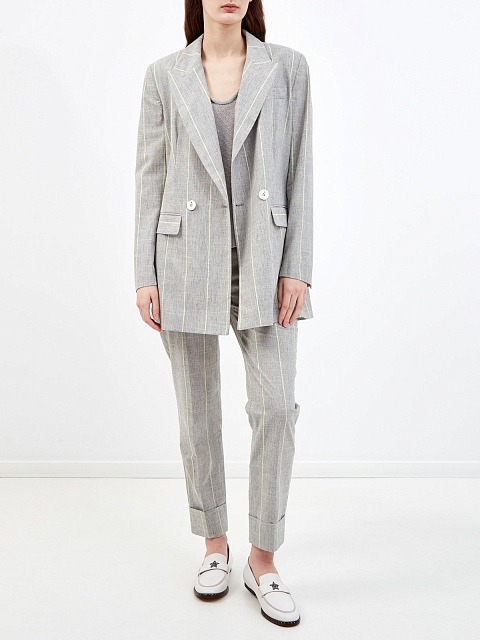 Двубортный блейзер от Lorena Antoniazzi создан из тонкой ткани на основе шерсти, хлопка и льна в пепельно-сером оттенке. Слегка жатая текстура материала смягчает строгие линии кроя. Контрастный мелованный принт в тонкую полоску создает дополнительные вариации цветовых сочетаний в образе. Детали: широкие лацканы, символика бренда на спинке. Сделано в Италии.