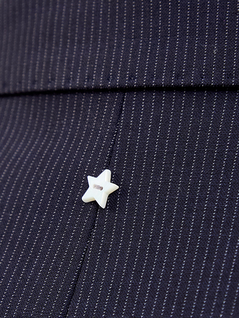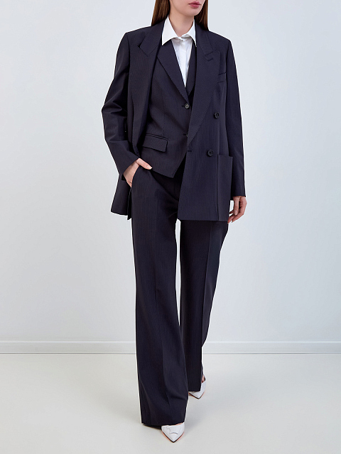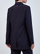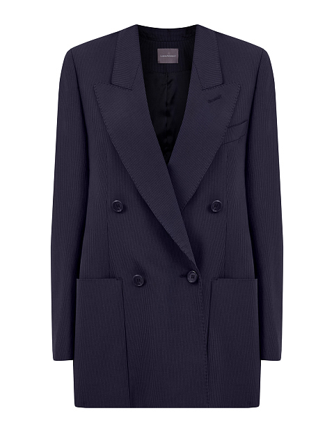Элегантный женский жакет от Lorena Antoniazzi создан из тонкой итальянской шерсти в оттенке ночного неба, эластичные волокна в составе препятствуют износу и образованию складок. Двубортная застежка на пуговицы и пунктирный узор в тонкую вертикальную полоску подчеркивают линии кроя. Фирменный штрих — символика бренда на спинке. Детали: заостренные лацканы, накладные макро-карманы, шлица на спинке. Сделано в Италии.