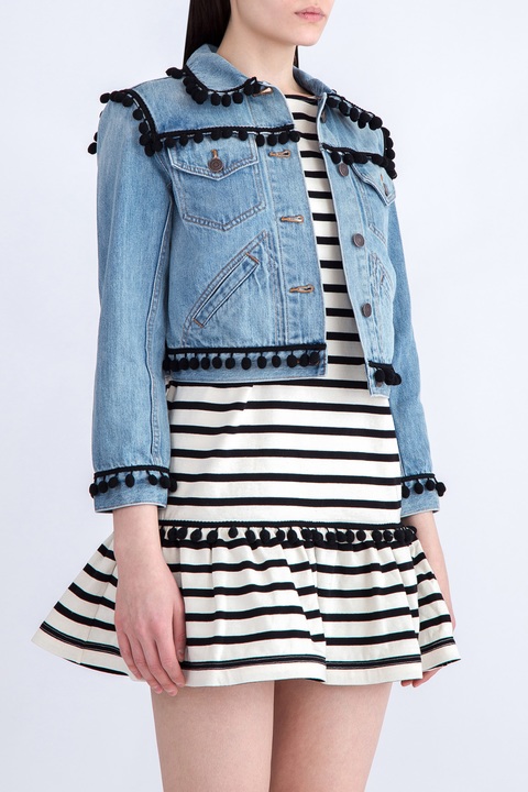 Женская куртка из весенне-летней коллекции Marc Jacobs выполнена из прочного хлопкового денима в классическом голубом оттенке с легким винтажным эффектом. Модель декорирована тесьмой с помпонами на отложном воротнике, кокетках, манжет рукавов и по нижней кромке. Изделие застегивается на металлические пуговицы с монограммой бренда.