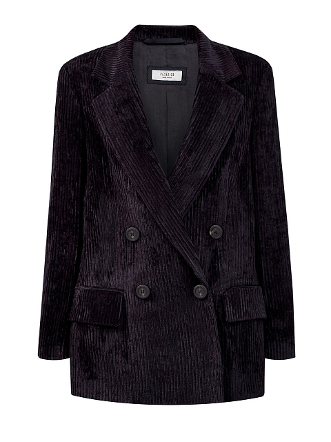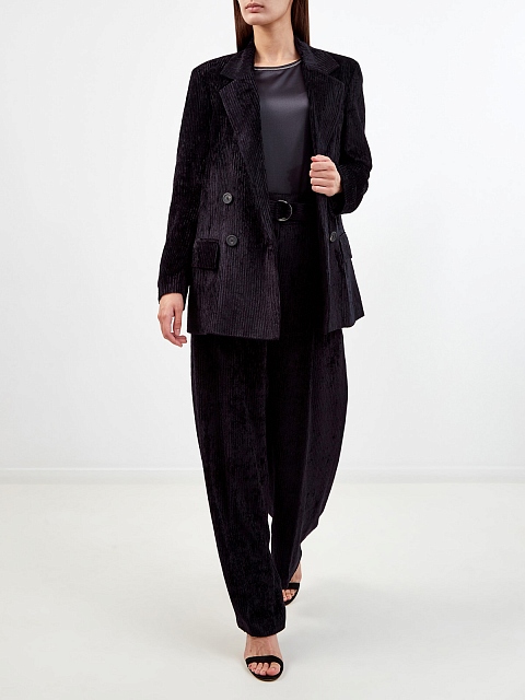 Элегантный блейзер кроя oversize от Peserico выполнен в оттенке ночного неба. Модель создана из бархатистого вельвета, мягкий струящийся материал идеально подходит для создания торжественных и вечерних образов. Детали: двубортная застежка на пуговицы, карманы с бортами, широкие лацканы.