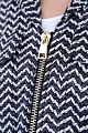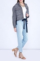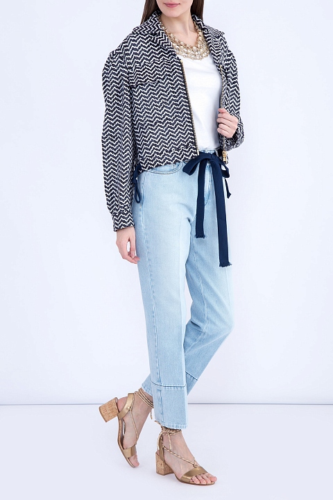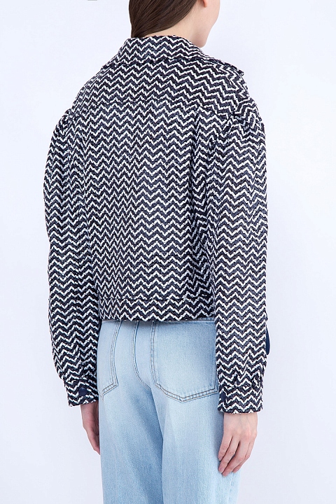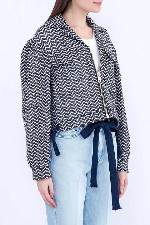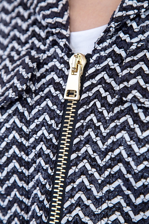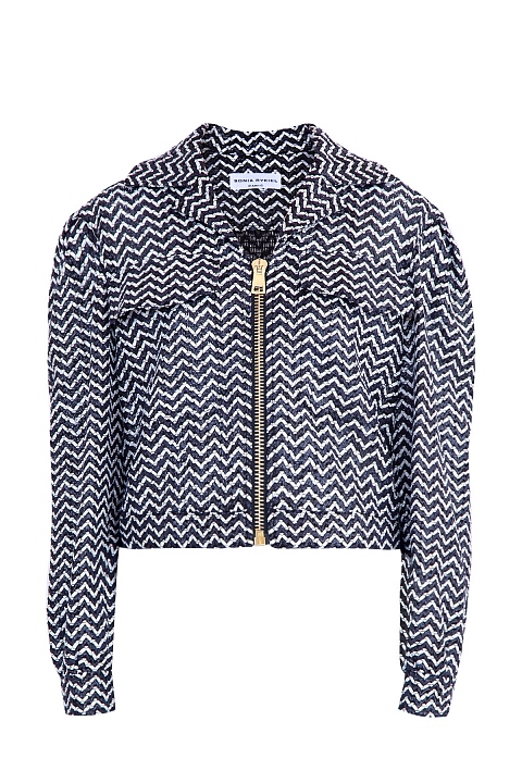 Укороченный жакет Sonia Rykiel создан из твида с лакированными нитями контрастного белого цвета, создающими узор «зигзаг». Модель без подкладки, с отложным английским воротом, увеличенными плечиками и объемными рукавами, образующими особенный силуэт. На груди прорезные карманы с клапанами и застежка на молнию.