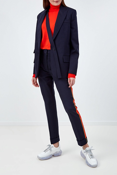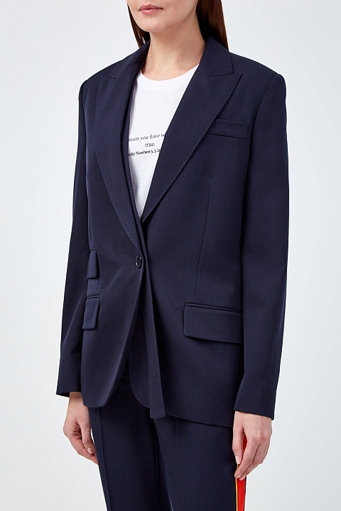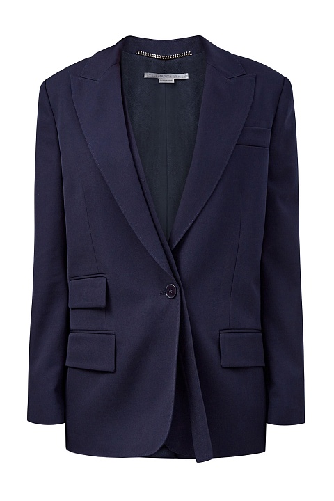 Лаконичный жакет Bell прямого oversize-кроя от Stella McCartney выполнен из костюмной шерстяной ткани в оттенке «синие чернила». Нотку иронии в образ вносят три прорезных кармана с клапанами на передних планках. Широкая лента удерживает полы изделия от распахивания в расстегнутом виде. Детали: полностью на подкладке из вискозы и хлопка, выполненная вручную отделка кромок, шлицы на спинке, застежка на пуговицы в тон.