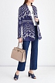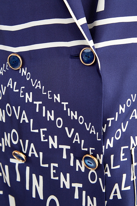 Эффектный двубортный жакет прямого кроя от Valentino создан из струящегося шелкового крепа с атласной поверхностью. Модель в густом синем оттенке дополнена архивным принтом Valentino Chevron в белой гамме из архивов 1969-70-х гг. Нотку расслабленного пижамного стиля придает отделка тонкой белой тесьмой. Детали: отложной ворот с лацканами, застежка на перламутровые пуговицы, два накладных кармана. Сделано в Италии.