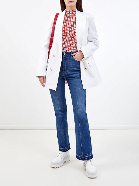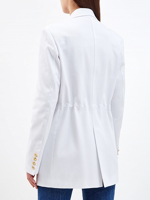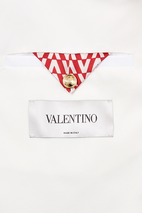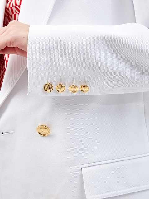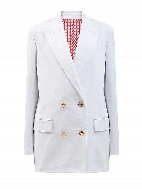 Блейзер удлиненного кроя от Valentino выполнен из плотного хлопкового габардина. Двубортная модель в элегантном белом цвете станет идеальным дополнением повседневных и деловых образов, литая фурнитура с архивным логотипом VLOGO подчеркивает фирменный стиль изделия. Эластичная вставка на спинке визуально моделирует силуэт. Детали: шлица, широкие лацканы, подкладка с принтом Optical. Сделано в Италии.