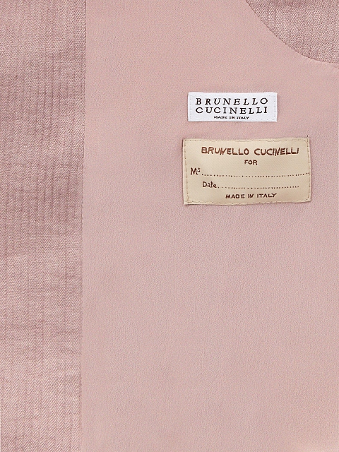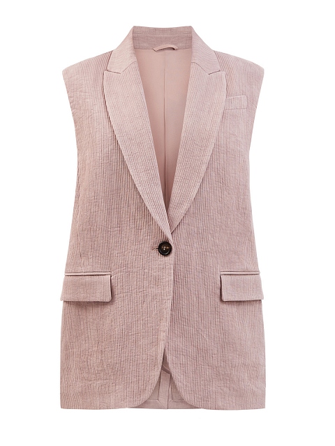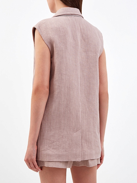 Удлиненный женский жилет от Brunello Cucinelli выполнен в мягком пудровом оттенке. Фактурная ткань из льняного и хлопкового репса подчеркивает линии кроя и остается комфортной в летний сезон. Широкие лацканы и изящная цепочка из ювелирных бусин Мониль на спинке делают образ элегантным и расслабленным одновременно. Детали: застежка на роговую пуговицу, шлица на спинке. Сделано в Италии.