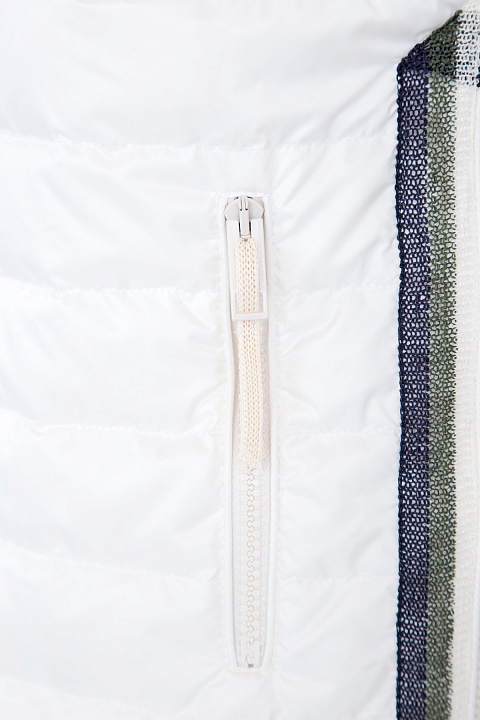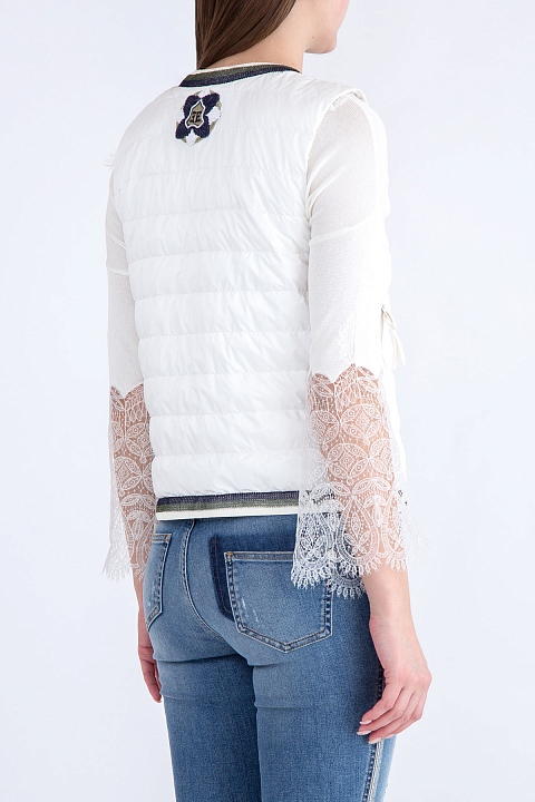 Невесомый и в то же время теплый женский жилет бренда Ermanno Scervino создан в стиле спортшик, которым вдохновлена вся весенне-летняя коллекция. Модель белоснежного тона дополнена фактурной вышивкой с изображением цветка на спинке и вязаной тесьмой, выполненной в оливково-зеленых и темно-синих тонах по кромкам. Изделие оснащено застежками-молниями на боковых швах и двумя прорезными карманами на передних планках. Сделано в Италии.