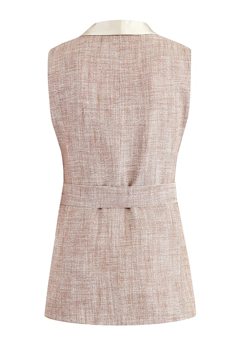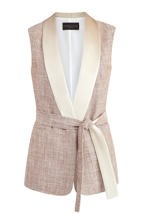 Элегантный жилет от Fabiana Filippi создан из фактурной ткани на основе волокон льна и шелка. Шалевый воротник выполнен из струящегося атласа холодного золотистого оттенка — знакового для всей коллекции материала. Изделие приталенного кроя с вытачками и внутренней подкладкой для посадки по фигуре. Потайная застежка завершает дизайн. Сделано в Италии.