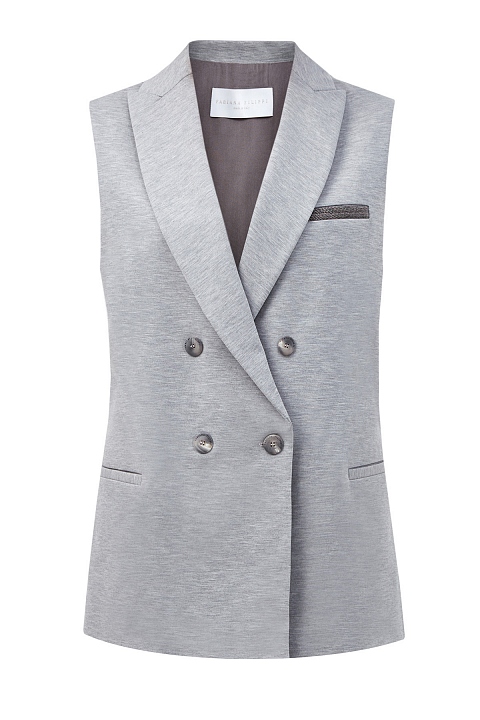 Двубортный жилет от Fabiana Filippi выполнен из хлопка с меланжевым эффектом. Классический крой с лацканами и прорезными карманами дополнен мерцающим акцентом — вышивкой бусинами ювелирной огранки. Полуподкладка обеспечивает посадку точно по фигуре. Сделано в Италии.